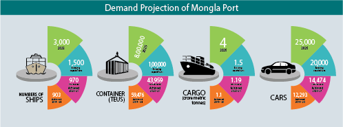 Seaborne trade has flourished in the south-western sector of Bangladesh. Consequently, the regional economy of the south-western sector is growing which has brought about large infrastructural development. Road networks are being developed inside and outside the port connecting Mongla port to the rest of the region. There are now more than 30 LPG and cement factories near the port area. When the Padma Bridge will be inaugurated, the distance between Dhaka and Mongla will be around 170 kilometres. This will make Mongla the closest port to the capital. With the development of other major infrastructural projects such as the Khan Jahan Ali Airport, Mongla port’s placement will make it strategically optimum with regards to transportation logistics and cost-efficiency.
