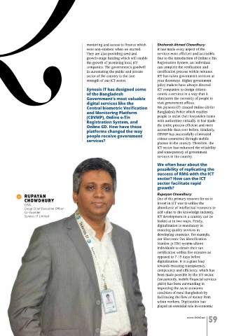 proportion unimaginable a decade ago. been made possible by the ICT sector. the health sector? most importantly, ensure the Shohorab Ahmed Chowdhury: planning with proper risk analysis respected company in the world.